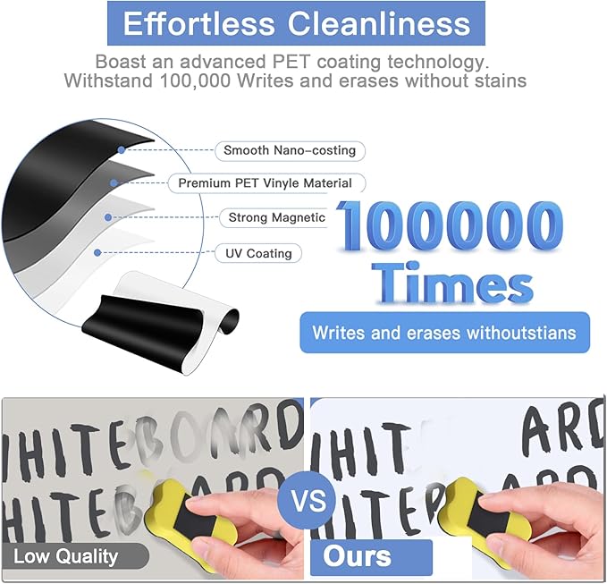- Effortless Cleanliness --- Our magnetic whiteboard boasts an advanced PET coating technology for a smooth, easy-to-clean surface. The magnetic fridge board can withstands 100,000 writes and erases without stains. Even after 30 days, marks wipe away effortlessly. Enjoy clear, smudge-free writing and convenience every time! (Stubborn stains can be removed with a damp cloth. )