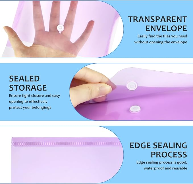 - Premium Quality: The plastic envelopes are made of thickened plastic, with good edge sealing workmanship, waterproof and reusable, and the clear envelopes allow you to directly see the documents inside, so you can easily find the documents you need without opening the envelope
