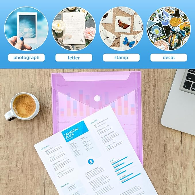 - for Any Occasion: You can use our plastic envelopes to store stamp and die, stickers, cash, photos, receipts, invoices, documents, notebooks, cards, letters, invitations, greeting cards, etc. Ideal for home, school, office, studio, store, conference, event, transportation