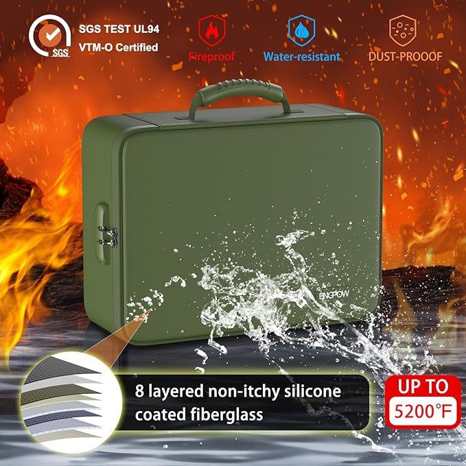 ENGPOW 5200℉ Fireproof File Organizer Bag with 13 Pocket Accordion File Folder,Document Organizer Box with Lock&Labels,Multi-Layer Portable Home Travel Safe Storage for Important Documents,Green
