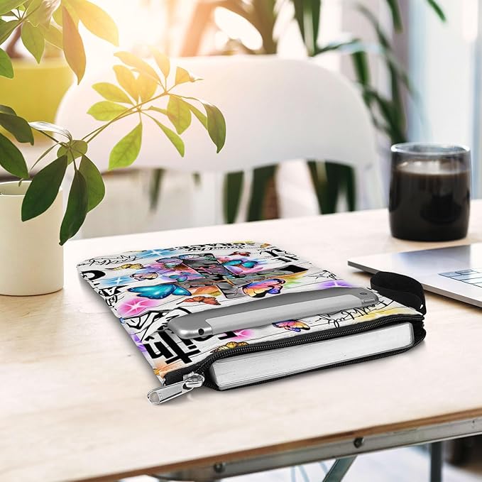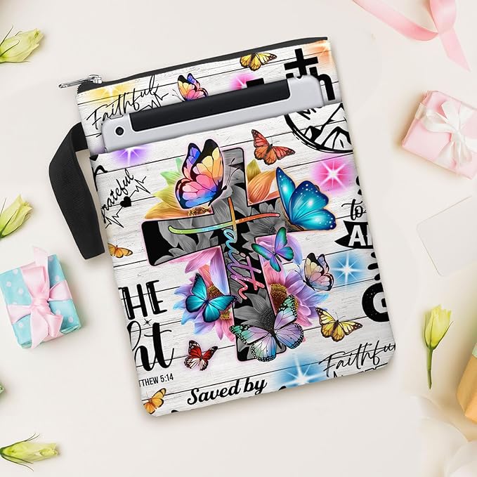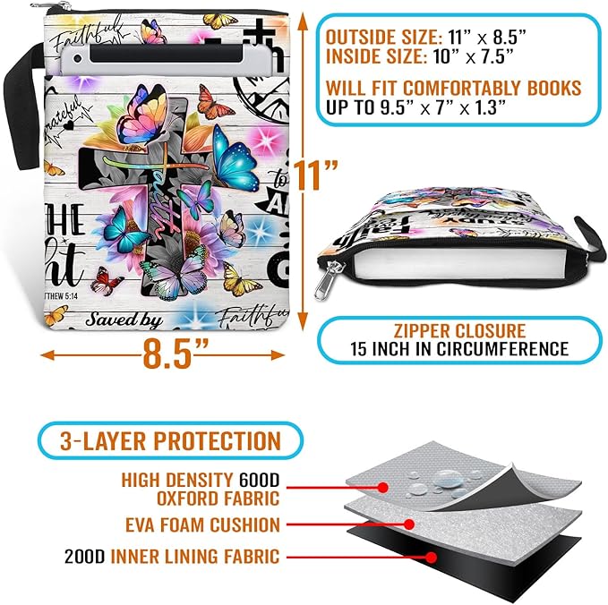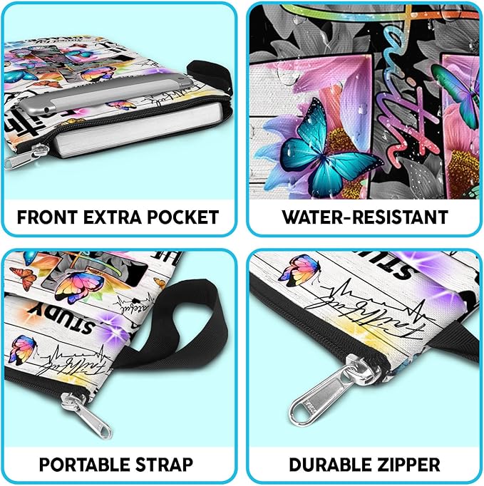 84hoods Book Sleeve With Zipper and Front Pocket. Christian Faith God Religious Gift. Bible Cover, Washable 11 X 8.5 Inch Padded. Gift for Book Lovers. Flowers and Butterflies.