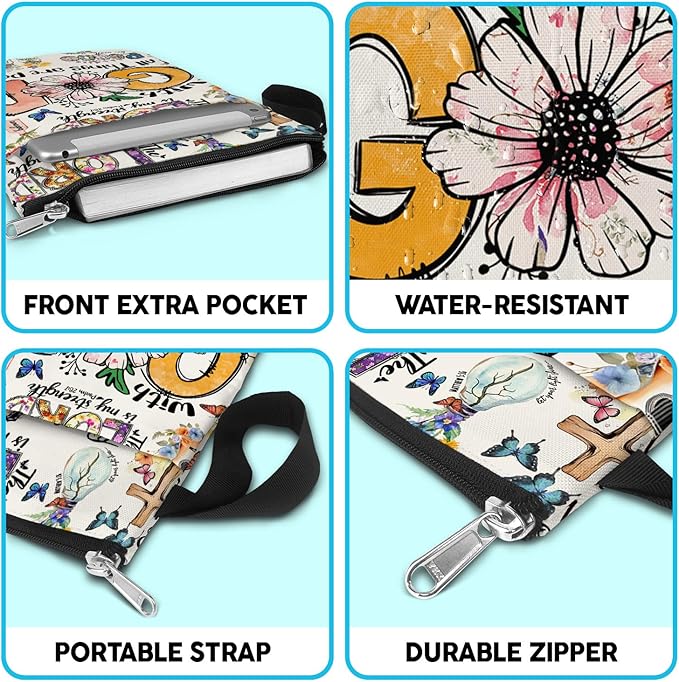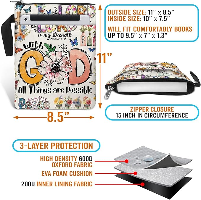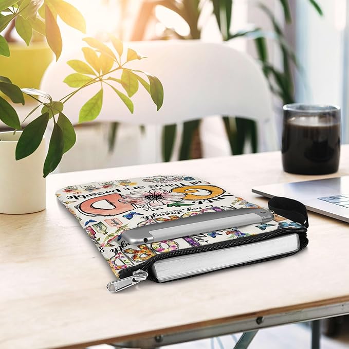84hoods Book Cover Bag with Zipper and Front Pocket. Bible Book Sleeve. Christian Faith God Religious Gift. Washable Fabric 11 X 8.5 Inch. All Things are Possible