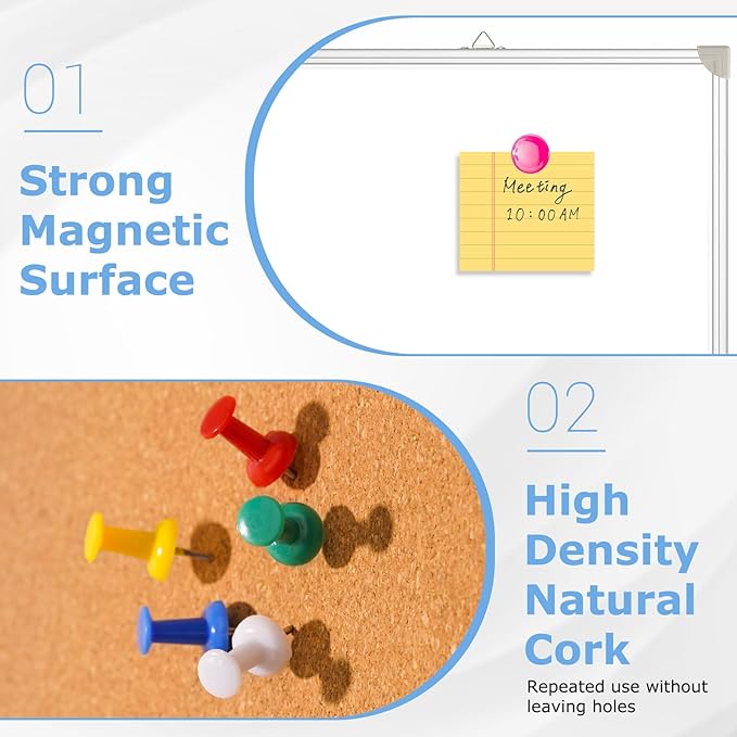 - Magnetic & Double sided surface: This whiteboard combo has a strong magnetic surface, with our included magnets, you can post documents, photos, etc. on the board. This big white board is also double sided, greatly increasing writing space to release your full inspiration.