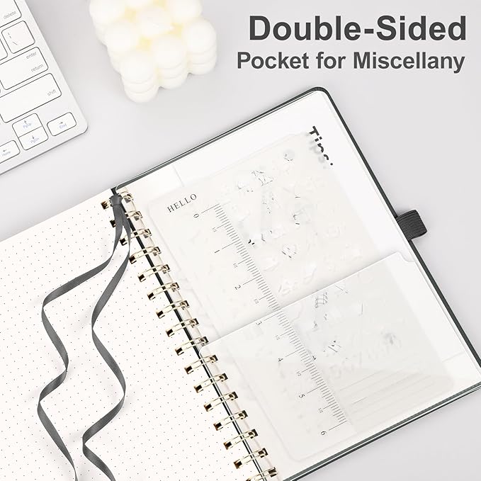 - PRACTICAL LAYOUT: Equipped an elastic band, a pen holder and removable bookmark ruler to keep your notebook organized. Comes with a DIY bookmark with a ribbon for self-attachment to the spiral, serving as a bookmark. Features a double-sided pocket for storing miscellany and 2pcs journal stencil for adding creative to your pages
