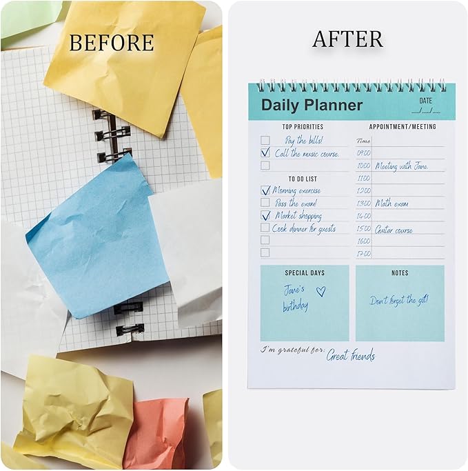 - PRACTICAL AND EASY: It is the perfect daily planner notebook for people who find digital planners complicated. It is a notepad to help you finish your work on time and organize your day. It is easy to use with its minimalist design. You will be more motivated to start your day with five color options.