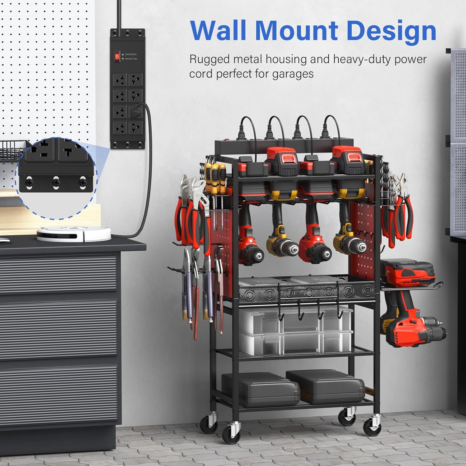 - Wall mount design, sturdy and durable, well made power strip and great for a workshop garage shop, Please protect if used as outdoor power strip.