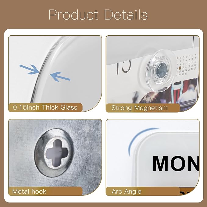 - 🧲TEMPERED GLASS & MAGNETIC: Made of 0.15inch Thick Tempered Glass, high strength and explosion-proof. The magnetic glass surface design allows you to hold some photos, papers, etc. and also use refrigerator magnets to decorate your glass board. We are equipped with 2 strong magnets.