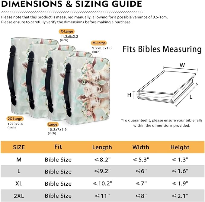 - 【MULTIPLE SIZES AVAILABLE】The Bible Case is available in four different sizes.M--6.3*9.2*1.6 inch; L--7*10.2*1.9 inch; XL--8*11.2*2.2 inch; 2XL--9*12*2.4inch. You can choose the one that fits your Bible perfectly.Please check the size chart before you purchase.