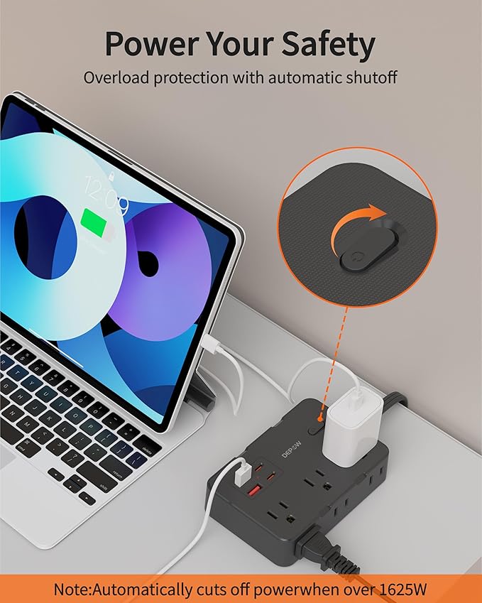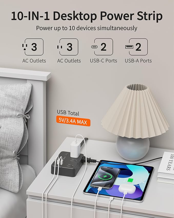 - 【10-in-1 Desktop Power Strip】: Equipped with 6 AC outlets and 4 USB (2 USB-C) ports, this slim 5 ft power strip turns 1 outlet into 10, allowing you to power 10 devices simultaneously to save more time. This extension cord with multiple outlets has a wide range of compatibility, it can compatible with laptop, PC, printer, TV, router, lamp, phone, watch, fan and more.