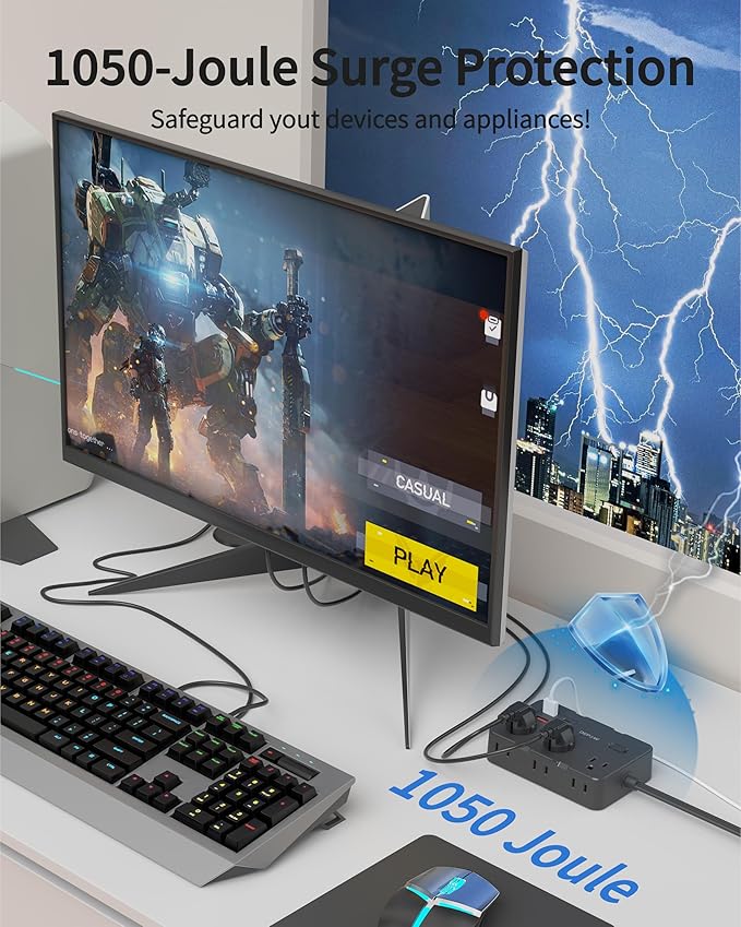 - 【All-Round Safety Protection】: This charging station has 8-fold safety protection -1050J surge protection, overload protection, over-current protection, short-circuit protection, over-voltage protection, overheat protection, grounded protection and flame-retardant. A reliable surge protector that protects your equipment safely during thunderstorms.