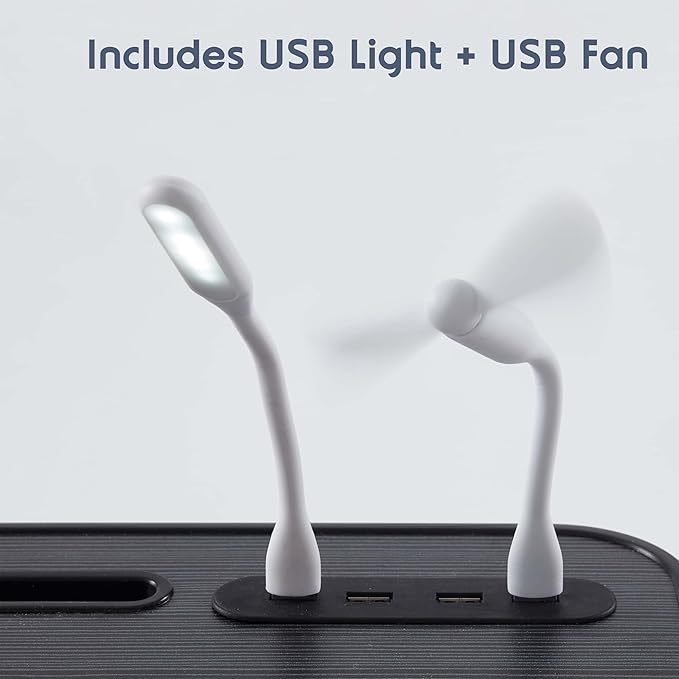 - Durable Construction: This lapdesk is crafted from durable and lightweight materials, ensuring maximum stability and a long-lasting product. It also includes a USB fan and light, which can be directly plugged into the USB ports for the perfect balance of productivity and comfort.