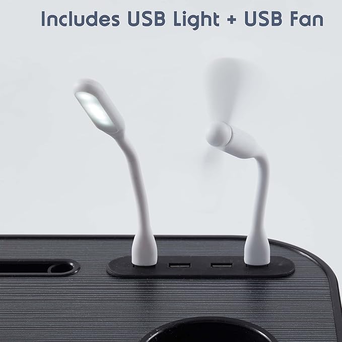 - Durable Construction: This lapdesk is crafted from durable and lightweight materials, ensuring maximum stability and a long-lasting product. It also includes a USB fan and light, which can be directly plugged into the USB ports for the perfect balance of productivity and comfort.