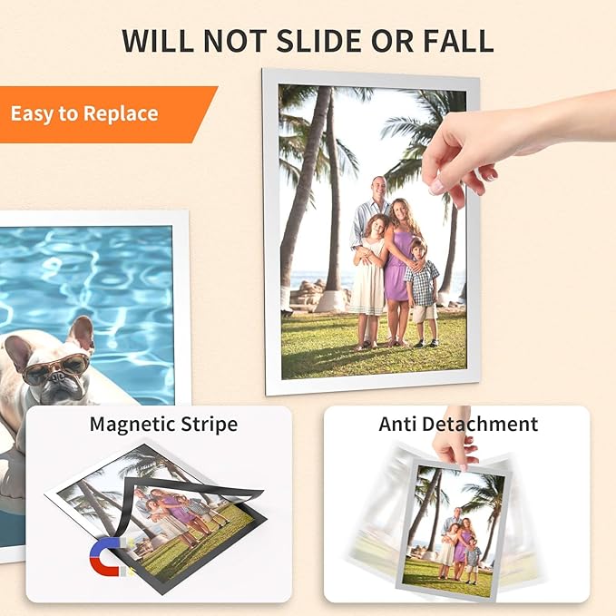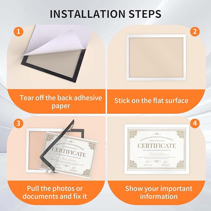 - Easy to Install & Replace: Open the magnetic sheet cover directly, put the 8.5in*11in pictures/documents you want to display, the cover closes automatically by magnetism, then stick the display frame to any flat surface, allowing quick insertion and exchange of the materials when you need to replace