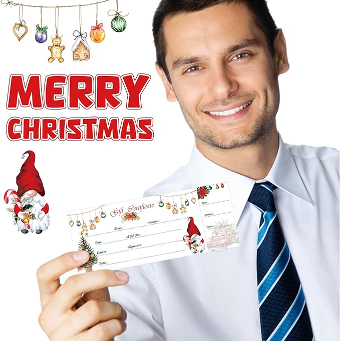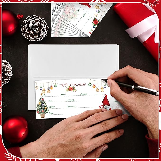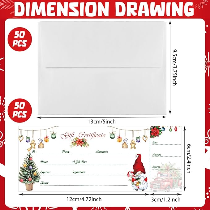Sinmoe 50 Sets Gift Certificate for Business with 50 Pcs Envelopes Blank Gift Certificate Cards with Name and Address Rustic for Beauty Salon Restaurants Birthday (Xmas Style,4.72 x 2.36 Inch)