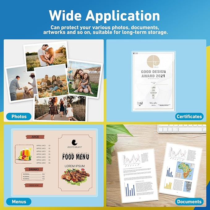 - Many Uses:Designed for protecting and preserving documents, laminating photos, office documents certificates, Insurance card, maps, awards, bookmark, calendars, kid's artwork'recipe cards, menu and more.It can be used in classroom, home and office.