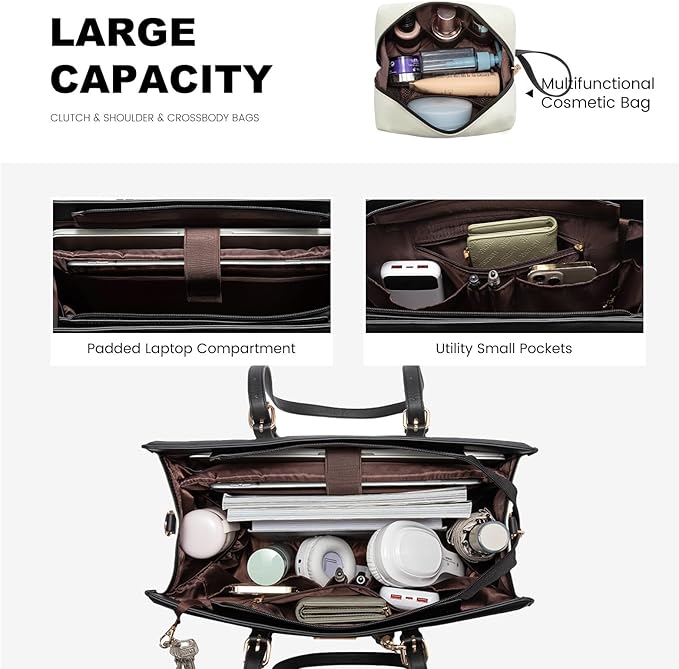- 📂【Large Capacity】The measure of computer bags for women : 16.2*7.1 *11.5 inches. Independent padded laptop compartment, give laptop the best protection. The main compartment has ample space for books, ipad, portable power supplies, A4 documents, passports, umbrellas and more. 3 inner pockets and 1 zipper pocket for small items such as phone, wallet, makeup, lip stik, passport etc.