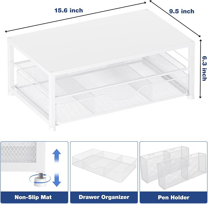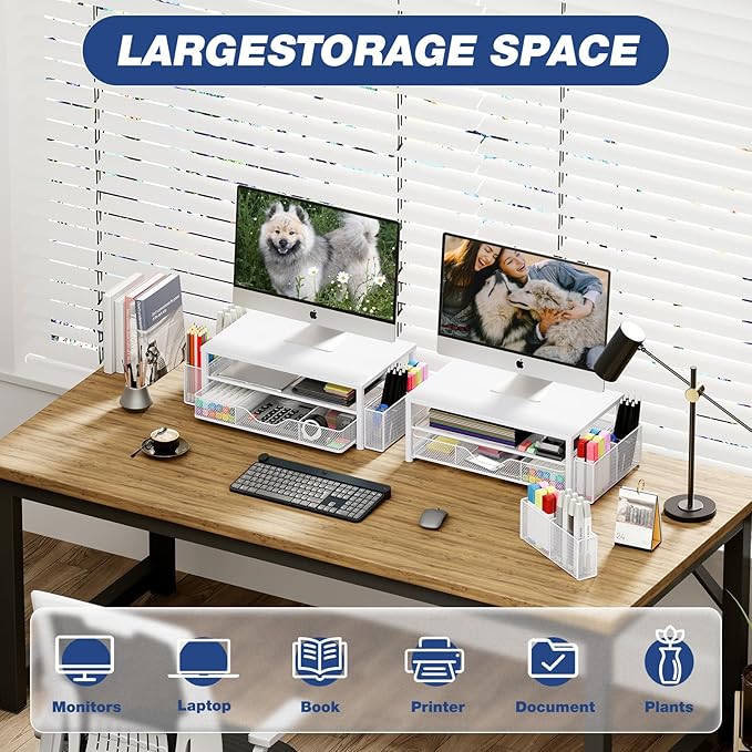 - Save Space:This 2-Tier monitor stand with drawer and 2 hanging pen holders provides ample storage space to keep your office supplies and office desk accessories neatly organized and easily accessible, keeping your workspace tidy and improving your sense of well-being