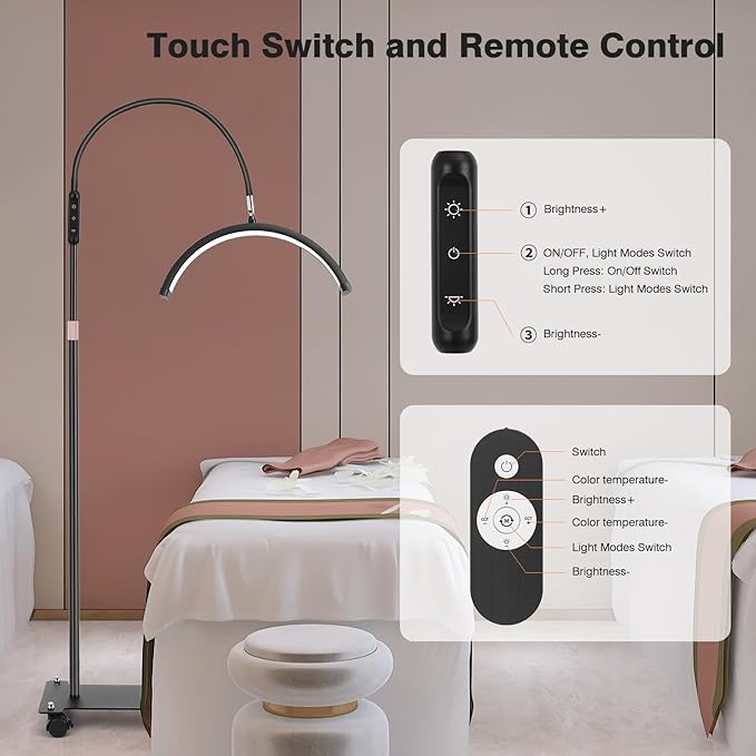 Lash Light for Eyelash Tech with Wheels, Half Moon Light for Lashes, Nails and Estheticians, LED Floor Lamp Adjustable Brightness and Color Modes (Black)