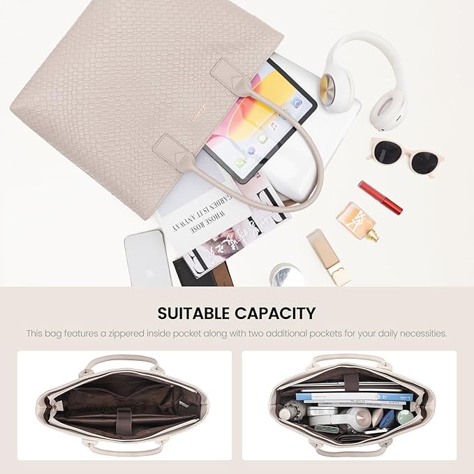 - Versatile Spacious Storage: This leather tote bag for women includes 1 large open pocket for A4 documents, books, clothing, 2 padded compartments for 15.6-inch laptop and iPad, 1 zippered pocket, 3 slit pockets, and 1 small zippered back pocket for your cell phone and keys. Secure and easy to use, it is the perfect long-term companion for work, shopping, dating, and college.
