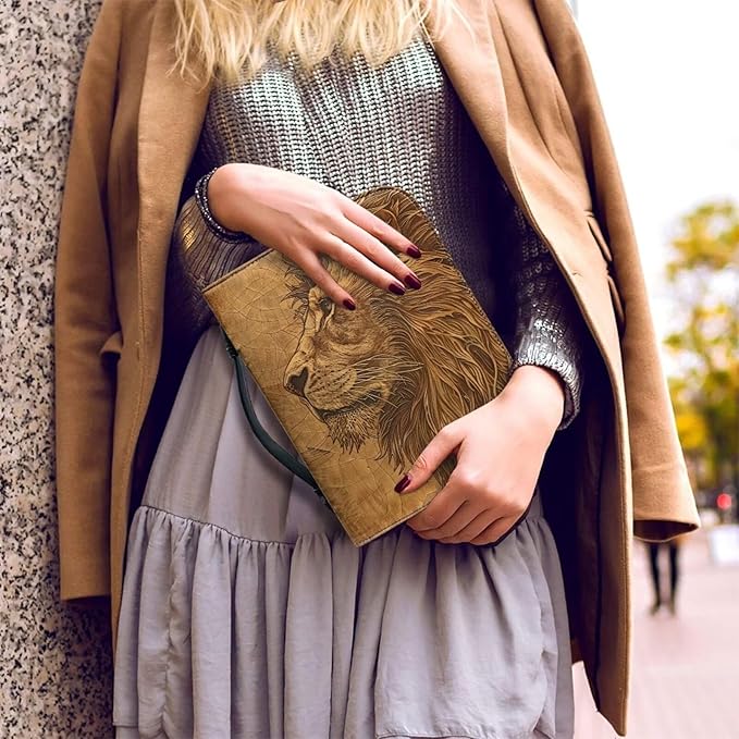 Lotusorchid Lion Print Bible Bag for Men, PU Leather Bible Cover Sturdy Bible Book Carrying Bags Christian Bible Study Accessories for Bible Study, Brown, L