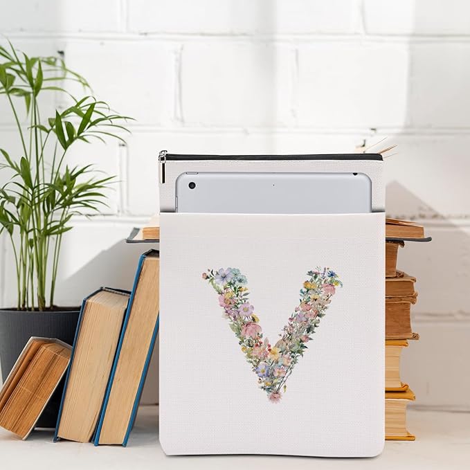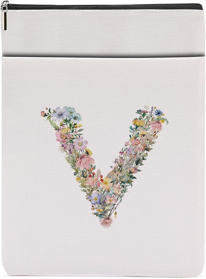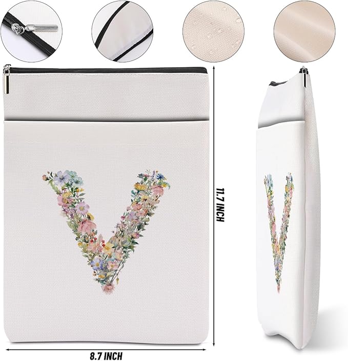 Monogrammed Book Sleeve Floral V Initial Book Pouch Book Accessories Book Lovers Gifts Waterproof Book Cover Book Protector Bookish Gifts Personalized Gifts for Women Girls Readers Bride Sister
