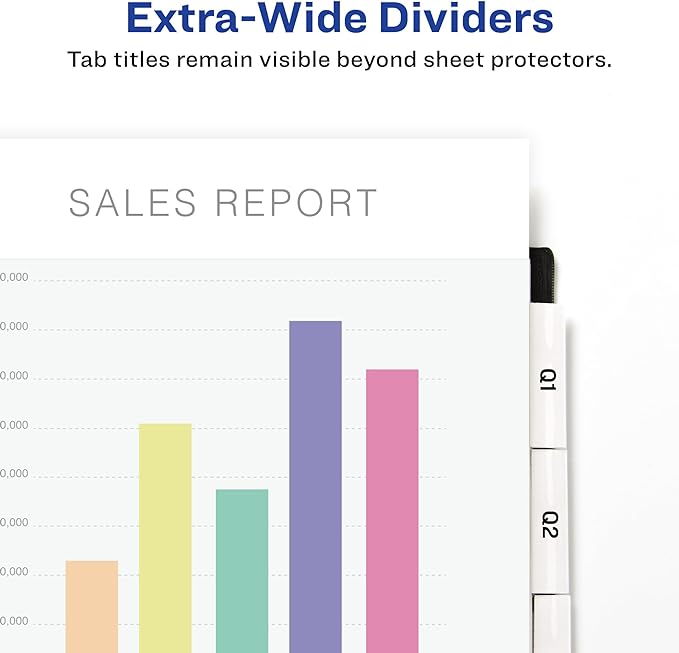 - Tab titles remain visible with perfectly-sized extra-wide dividers with tabs that extend beyond sheet protectors