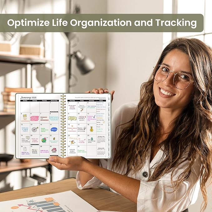 - Stylish and Functional Design: The ZOTIA 2025 Planner combines thick, high-quality paper with a durable hardcover, designed to fit your lifestyle. Monthly tabs, twin-wire binding, and an elastic band for secure closure add practicality while maintaining a sleek, modern aesthetic.