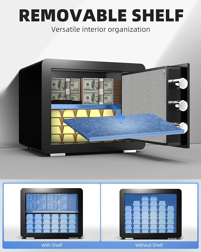 - VERSATILE INTERIOR ORGANIZATION - Our safe box offers ample space and customization with a removable shelf and a built-in key rack. Enhanced interior protection with custom carpet lining safeguards your valuables from damage. Plus, the interior sensor lighting ensures effortless access, even in the dark.