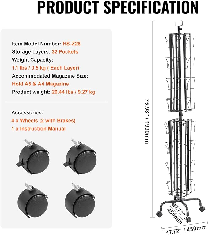 - 360° Spinning Display, Easier Viewing: VEVOR's rotating postcards display rack offers an innovative approach to showcasing your files. Its unique 360° rotation enhances visibility from multiple angles, making accessing your brochures easier. No need to flip back and forth—simply rotate the display 360 degrees for efficient displaying!
