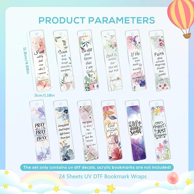 - UV DTF Wraps for Bookmark: UV DTF transfer stickers contain 12 patterns, two sheets of each pattern, 24 sheets in total, acrylic bookmarks are not included. You can use these bible verse uv dtf transfer stickers on blank acrylic bookmarks
