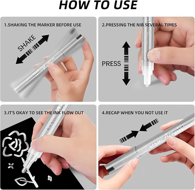 - WHY CHOOSE US: Compared with other acrylic paint pens, our silver paint pen metallics feature bright colors and strong coverage, which can easily cover darker colors and textures. Whether you are painting on various surfaces such as wood, rocks, glass, metal, ceramic, fabric, paper, and more. our silver acrylic paint pens can help you show the best results.