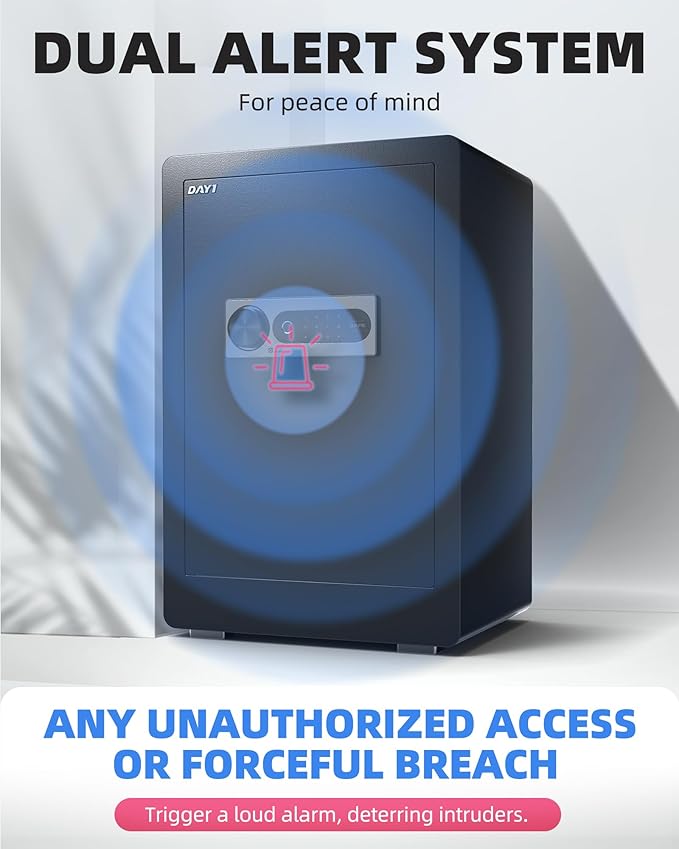 • DUAL ALERT SYSTEM FOR PEACE OF MIND - Featuring a dual alarm warning system, the DAYI home safe ensure your belongings are protected. Any unauthorized access or forceful breach triggers a loud 70-decibel alarm, effectively deterring intruders and providing heightened security.