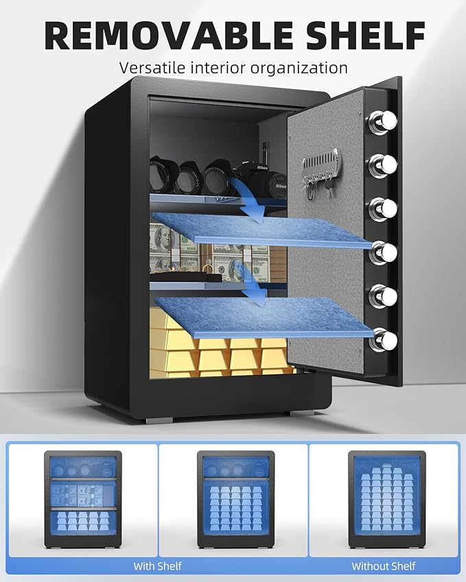 • VERSATILE INTERIOR ORGANIZATION - Our safe box offers ample space and customization with a removable shelves and a built-in key rack. Enhanced interior protection with custom carpet lining safeguards your valuables from damage. Plus, the interior sensor lighting ensures effortless access, even in the dark.