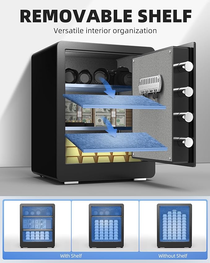 - VERSATILE INTERIOR ORGANIZATION - Our safe box offers ample space and customization with 2 removable shelves and a built-in key rack. Enhanced interior protection with custom carpet lining safeguards your valuables from damage. Plus, the interior sensor lighting ensures effortless access, even in the dark.