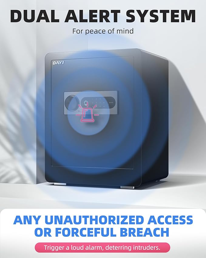 - DUAL ALERT SYSTEM FOR PEACE OF MIND - Featuring a dual alarm warning system, the DAYI home safe ensure your belongings are protected. Any unauthorized access or forceful breach triggers a loud 70-decibel alarm, effectively deterring intruders and providing heightened security.
