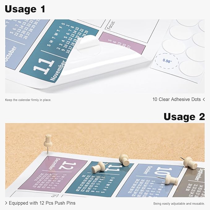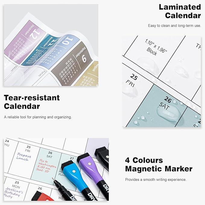 - ✨ Laminated Calendar with Dates: Waterproof wall calendar comes with a mini eraser, four dry-erase markers, 12 push pins, and 10 transparent round stickers. 12 months calendar covers the time range from Jan 2025 to Dec 2025, making it perfect for long-term use.