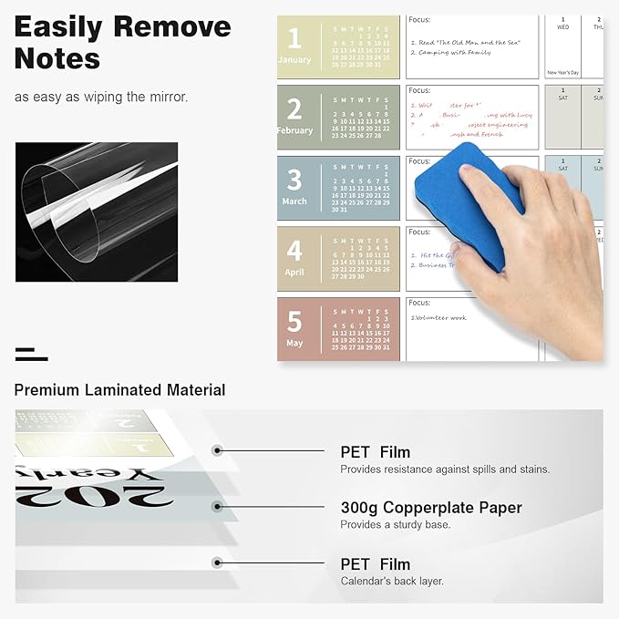 - ✨ Dry Erase Wall Calendar : is made of PET Film and 300 grams Copperplate Paper, providing a durable surface that resists scratches and smudges, while the sturdy Copperplate Paper backing keeps it in place without curling.