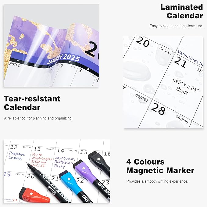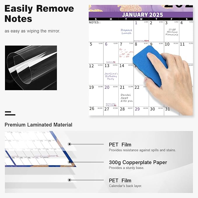 - ✨ Dry Erase Wall Calendar : is made of PET Film and 300 grams Copperplate Paper, providing a durable surface that resists scratches and smudges, while the sturdy Copperplate Paper backing keeps it in place without curling.