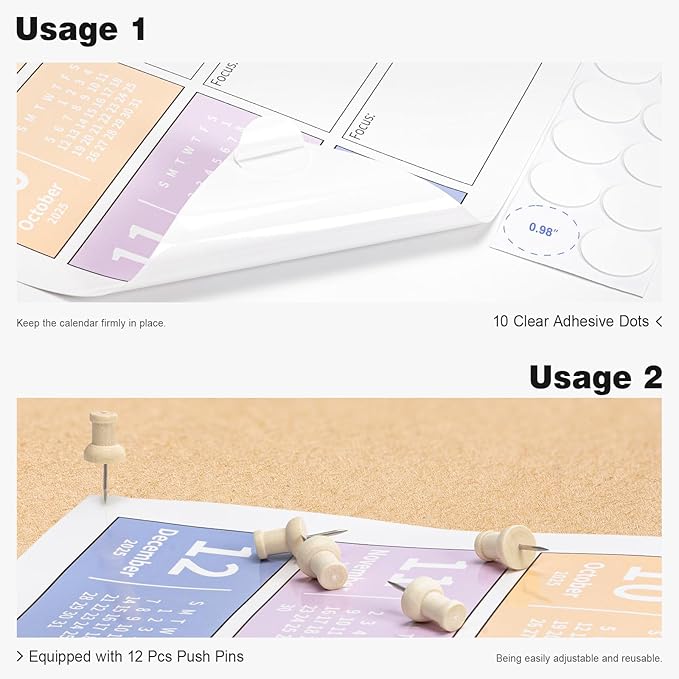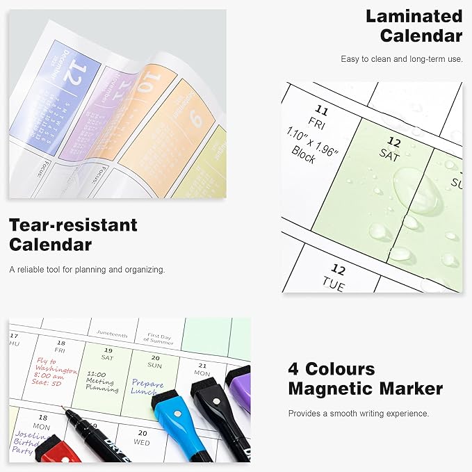 - ✨ Laminated Calendar with Dates: Waterproof wall calendar comes with a mini eraser, four dry-erase markers, 12 push pins, and 10 transparent round stickers. 12 months calendar covers the time range from Jan 2025 to Dec 2025, making it perfect for long-term use.