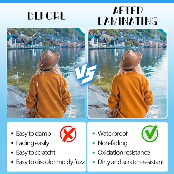 - Excellent Clarity:The laminating sheets only use high-quality adhesive for best transparency to ensure that the photos and documents are clearly visible let important information show through! Round corner design, safe to use