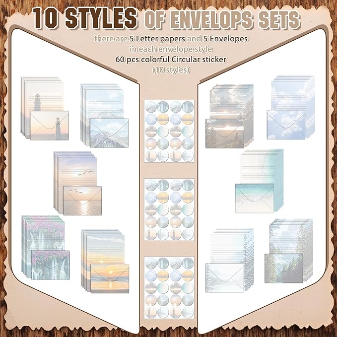 - Diversified Scenic Nature design: The Scenic Stationery Variety stationery set has 10 different styles, combining Patterns such as clouds, beaches, sunsets, morning mist, flying birds, etc. You can choose your favorite pattern style to write letters to friends according to your preferences, which will make your letters more attractive.