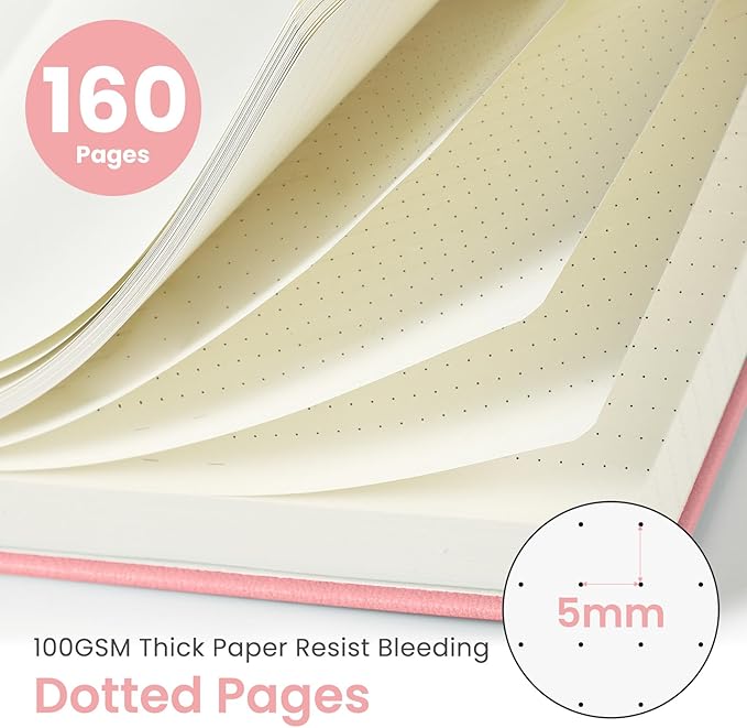 - 160 Pages Dotted Journal: Discover the freedom of 5mm-spaced dotted pages, perfect for bullet journaling, sketching, and organizing. The subtle dot grid provides structure without limiting creativity, helping you easily design layouts, track goals, and develop ideas in your personal style.