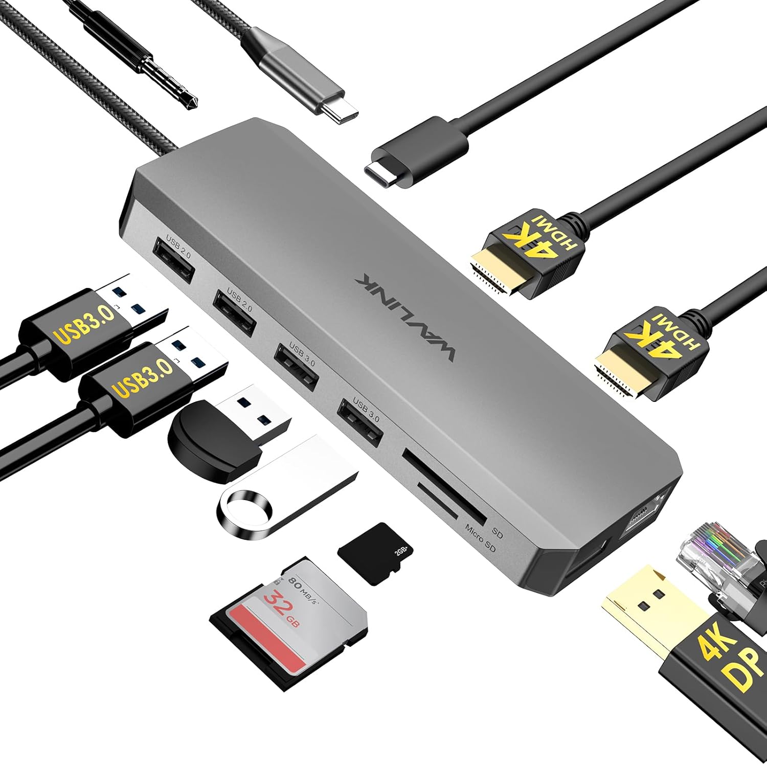 WAVLINK USB C Docking Station Dual Monitor, USB-C Hub Laptop Triple Display with 2 HDMI,DisplayPort, 100W PD Charging, Ethernet, 5 USB, SD/TF Read, Audio for MacBook Dell HP Lenovo Surface, Grey