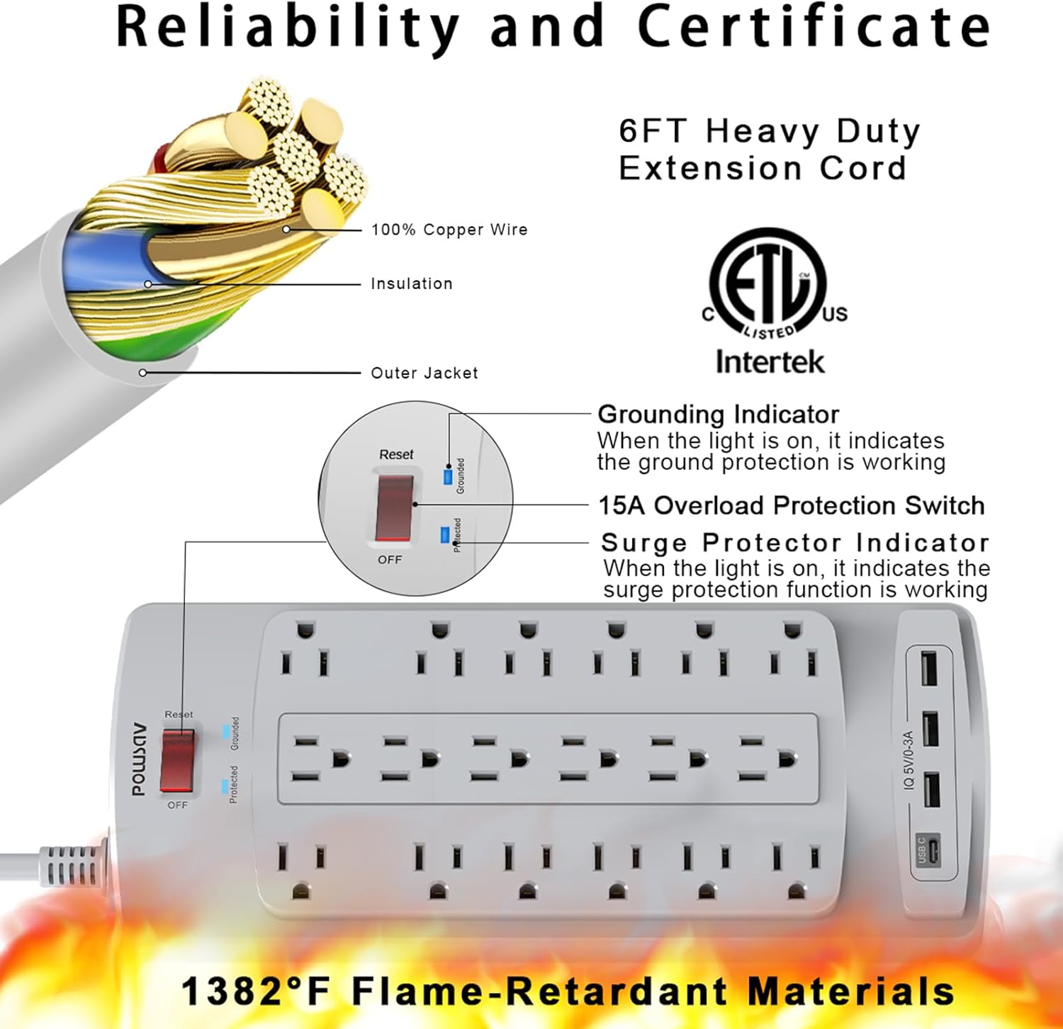 - Safety and Certificate: ETL safety certified, with extension cord and other major components certified by UL. The over current protection switch limits the power strip's working current to certain setting, so it will not get hot during usage. Environmental protection and fire-resistance PC shell with flame retardant at 1382℉ makes it more durable and longer lifetime.