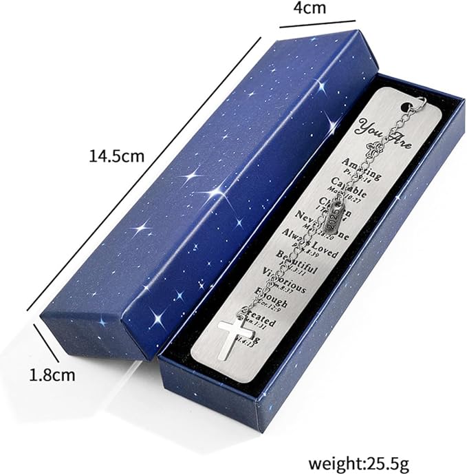 - 【Christian Gifts】Metal bookmark with cross chain and inspirational words: "You Are Amazing Ps.139:14 Capable Mark.10:27 Chosen 1 Thess.1:4 Never Alone Matt.28:20 Always Loved Rom.8:39 Beautiful Eccl.3:11 Victorious Rom.8:37 Enough 2 Cor.12:9 Created Gen.1:31 Strong.Phil.4:13" .Best Gift for your children sister families best friend coworkers students