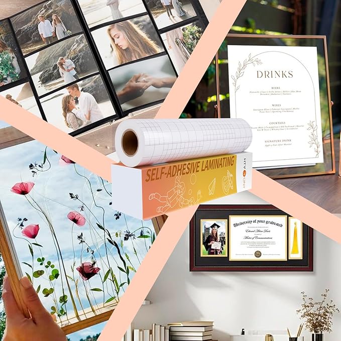 - PREMIUM QUALITY: HTVRONT self-adhesive laminate roll are from high-quality material, which is thin and transparent with excellent adhesion. Hence, the adhesive laminating film can work perfectly to cover your essential documents and photos, protecting them from fading and damaging for a long time. Note: the excellent adhesion makes it hard to adjust the place once it is glued,please test with waste paper before first use