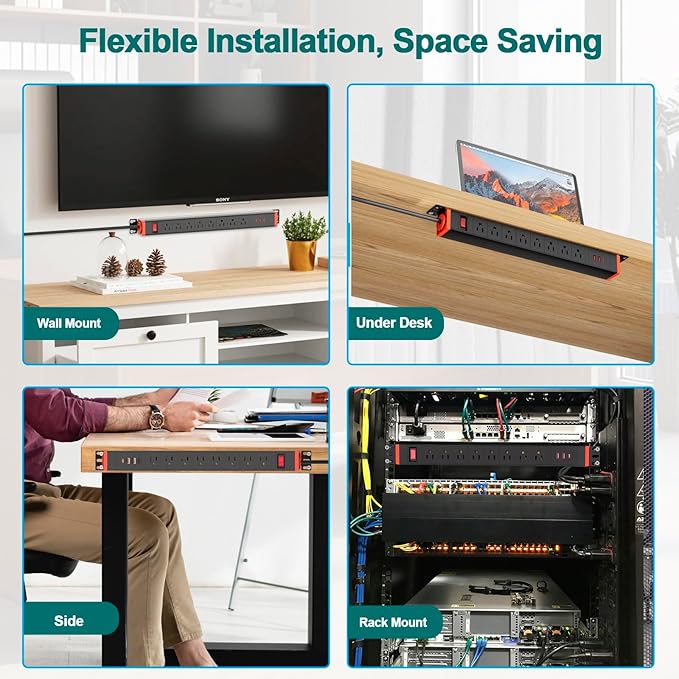- 【Rack Mount Power Strip with 360° Rotating Brackets】Equipped with innovative 360-degree rotating brackets, this metal power strip provides versatile installation. It can be mounted on walls, desks, and furnitures, it is also compatible with rack equipment.