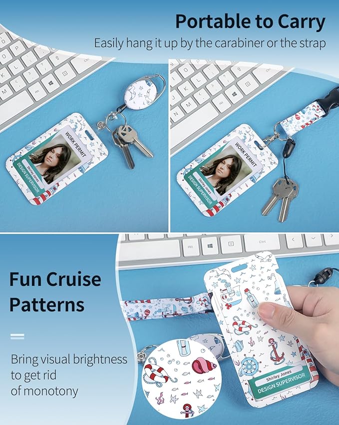 Uniclife Fashionable Sliding Badge Holder Cruise Pattern Plastic Case with Retractable Badge Reel Carabiner Clip & Detachable Lanyard Strap Vertical Card Protector for Women Nurse Teacher Student
