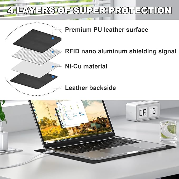 - PREMIUM QUALITY MATTER Our laptop pad is made of 4 layers of matter The middle two layers are layers of reinforced shielding Faraday fabric and aluminum foil The top and bottom layers are made of high-quality leather to dissipate heat from your laptop