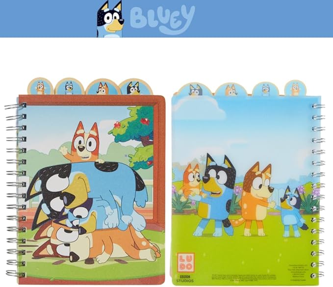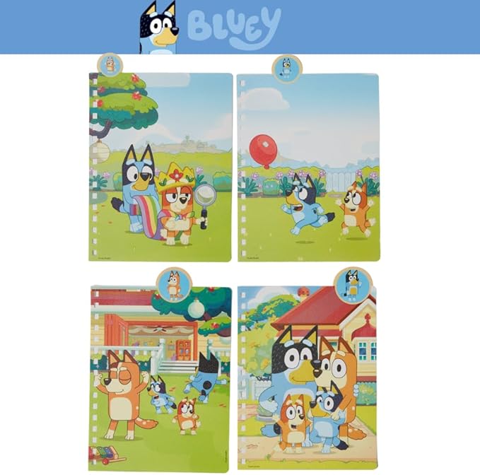 - BLUEY NOTEBOOK - Features Bluey, Mum, Dad, and Bingo on the front cover, lined pages with color images of Bluey characters on the corners, 4 color illustrated section dividers, and tab dividers.